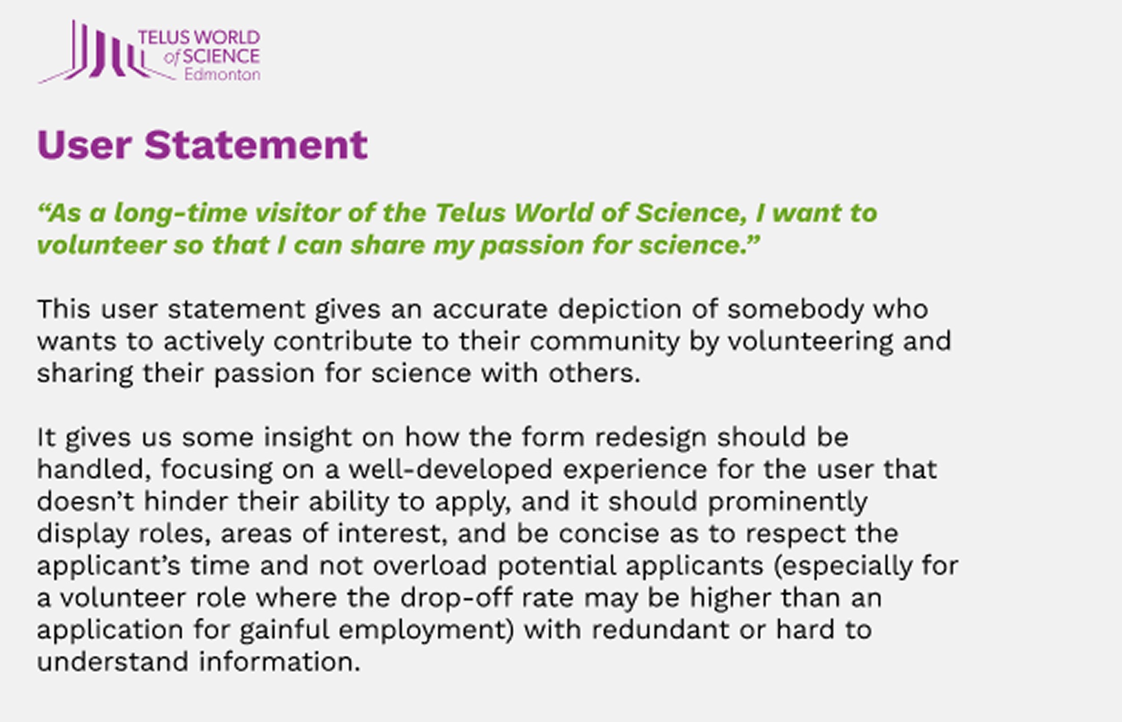 A long and confusing form doesn't reflect the approachable, science-forward brand of the Telus World of Science. Volunteers were left without clear guidance, a logical structure, or the confidence they were filling it out correctly.
